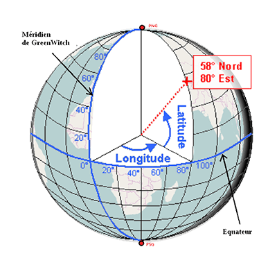 La position d'un point à la surface de la Terre est données par deux angles : la longitude et de la latitude.