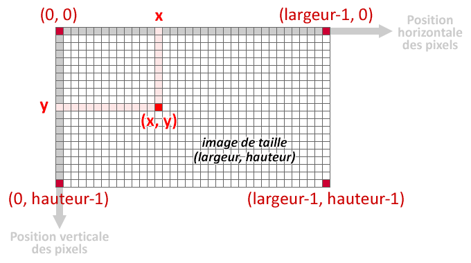 Le schéma ci-dessous précise la façon dont sont déterminées les coordonnées \((x, y)\) des pixels dans les objets de type Image.